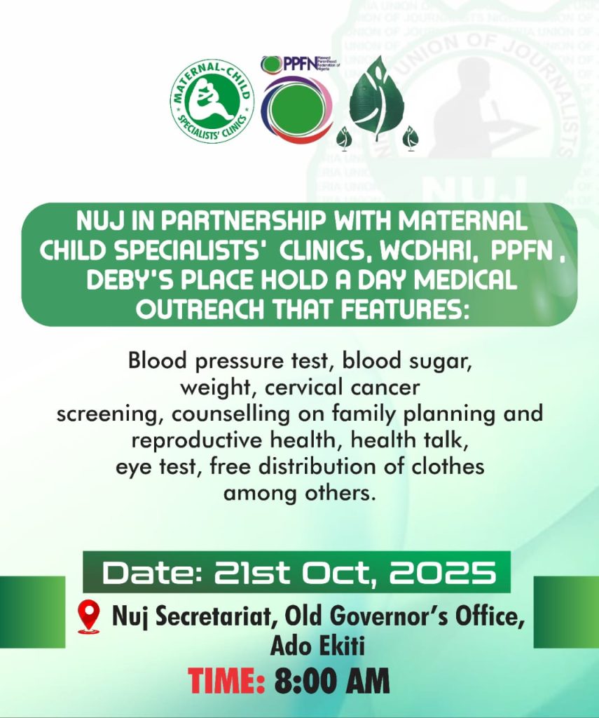 The Nigeria Union of Journalists (NUJ), Ekiti State Council, in partnership with Maternal-Child Specialists’ Clinic, Women and Children Development and Health Research Initiative (WCDHRI), Deby’s Place, and Planned Parenthood Federation of Nigeria (PPFN) is set to organise a free medical outreach as part of lined-up programmes for its 2025 Press Week.